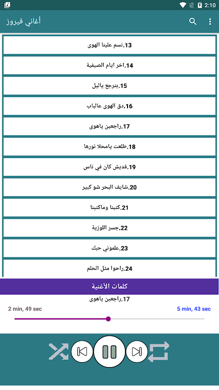 另外,如果您是安靜的埃及歌曲的粉絲,則此應用程序是專為您設計的,Fairouz夫人在這裡演唱了許多輕浮的歌曲以及愛情和浪漫的歌曲,因此她的歌曲被視為情侶和情人的歌曲。