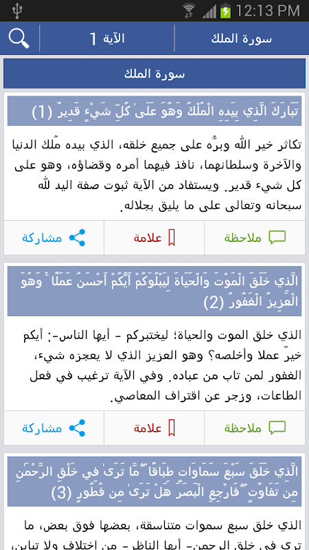 تفسير القران الكريم كامل بدون انترنت وفيه فهرس السور وفهرس آيات السورة المختارة وإمكانية البحث في القرآن الكريم مع إمكانية كتابة ملاحظة على إعراب آية معينة وإمكانية وضع علامات متعددة على الآيات وإمكانية مشاركة نص الآية مع إعرابها عبر الفيس بوك والواتس أب وغيره وقائمة بجميع الملاحظات المكتوبة وقائمة بجميع الآيات التي عليها علامة