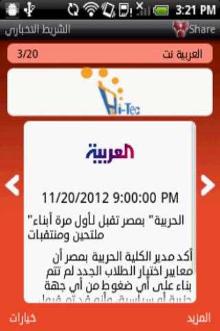 يعد الشريط الإخباري التطبيق الأول من نوعه المتميز بفكرته والذي يظهر كشريط متحرك أسفل شاشة الجوال ويعمل على بث متواصل لقنوات إخبارية مختلفة و يمكنك تكبيرالشريط لتقرأ آخر الأخبارمن أشهر القنوات الإخبارية مثل العربية، الجزيرة،سي ان ان..الخ كما يمكنك زيادة قنواتك من خلال الاشتراك في المزيد من القنوات المجانية.