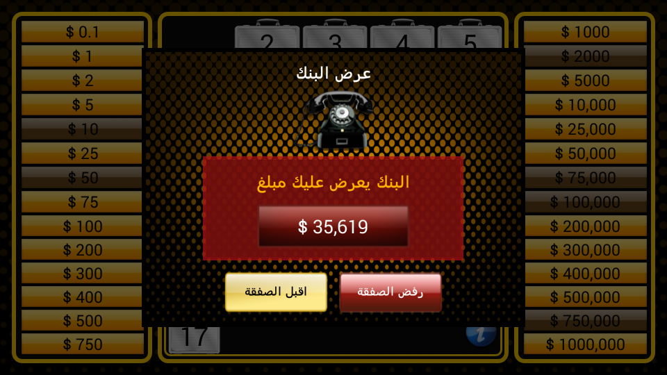 ★ هدفك هو الحصول على أكبر مبلغ أما اذا اخترت خيار قبول الصفقة فستقبل بعرض البنك ويشتري منك الحقيبة ثم سيعرض قيمة الحقيبة التي اشتراها منك وعندها ستعرف اذا ماكانت الصفقة ناجحة ام خاسرة