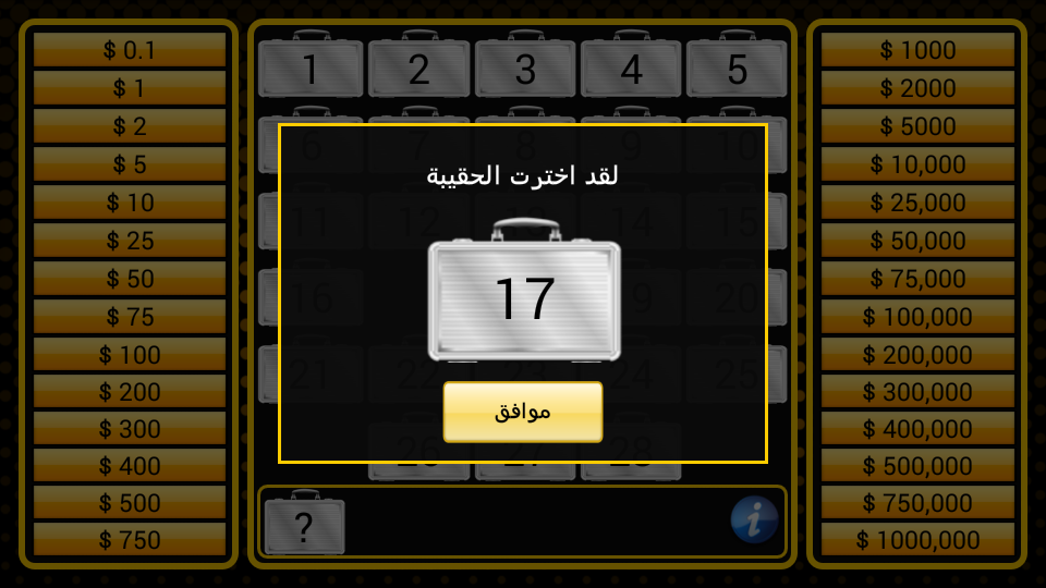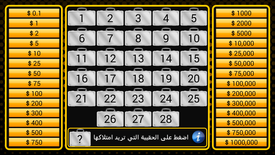 في بداية اللعبة عليك اختيار احدى الحقائب المرقمة من 1 الى 28 حقيبة وبعدها تبدأ المغامرة