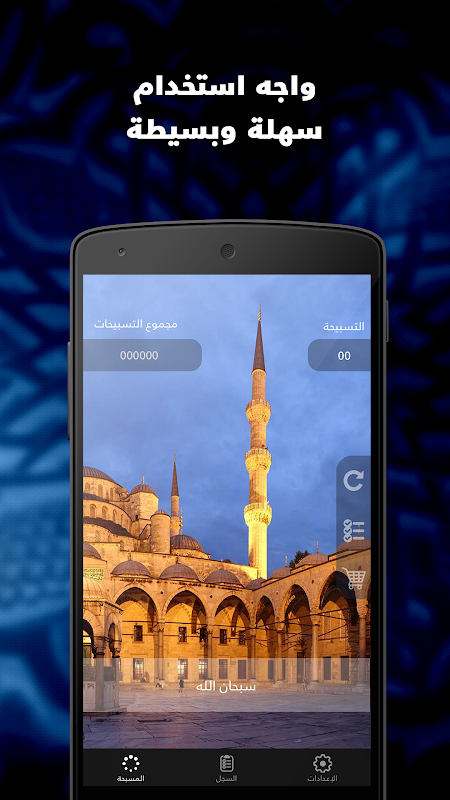 - عداد التسبيحات يحفظ عدد التكرارات للمسبحة.