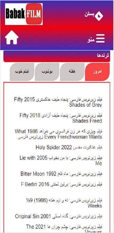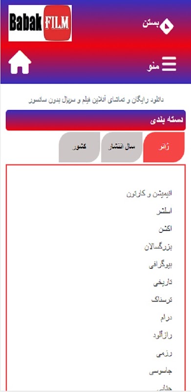 Babak Film 是一項 100% 免費的線上下載和觀看未經審查的電影和連續劇的服務,為國內外所有講波斯語的人提供高品質的波斯語配音和字幕;還可以下載和觀看國外的電影。