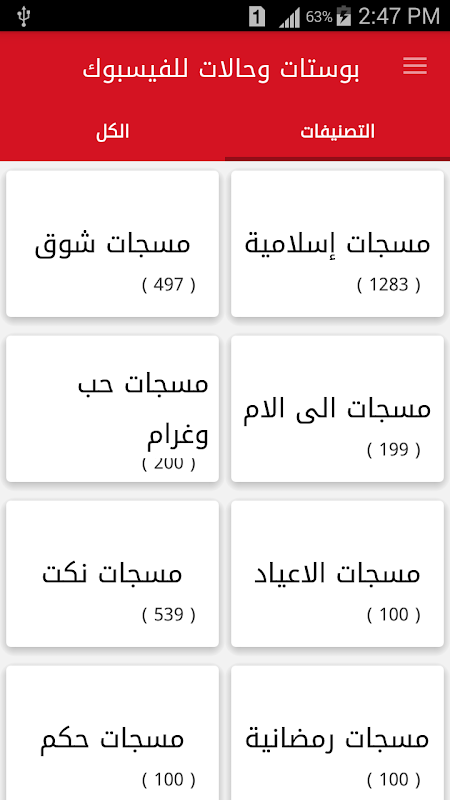 تطبيق عربي يرصد اهم المسجات والاقتباسات المتداولة على شبكة الانترنت، ويجمعها في تصنيفات متنوعة، من رسائل الاسلامية، ورسائل حب، ونكت منوعة، واقتباسات عن اهم الشعراء العرب، وتصنيفات اخرى عديدة سوف تعرفها عندما تقوم بتحميل التطبيق على هاتفك واستخدامه، تطبيقنا يحتوي على الاف المسجات المنوعة والتي يمكن ان تشاركها لأصدقائك ومعارفك عن طريق الواتس اب ، والفيس بوك وجميع تطبيقات التواصل الاجتماعية المشترك بها، عن طريق ادوات تم اضافتها لمساعدتكم على التفاعل مع اصدقائكم واقاربكم وحتى زملائكم بالعمل .