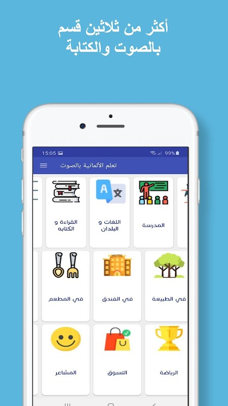 該應用程序包含德語中最重要的單詞和短語,並以聲音和圖像的發音方式翻譯成阿拉伯語