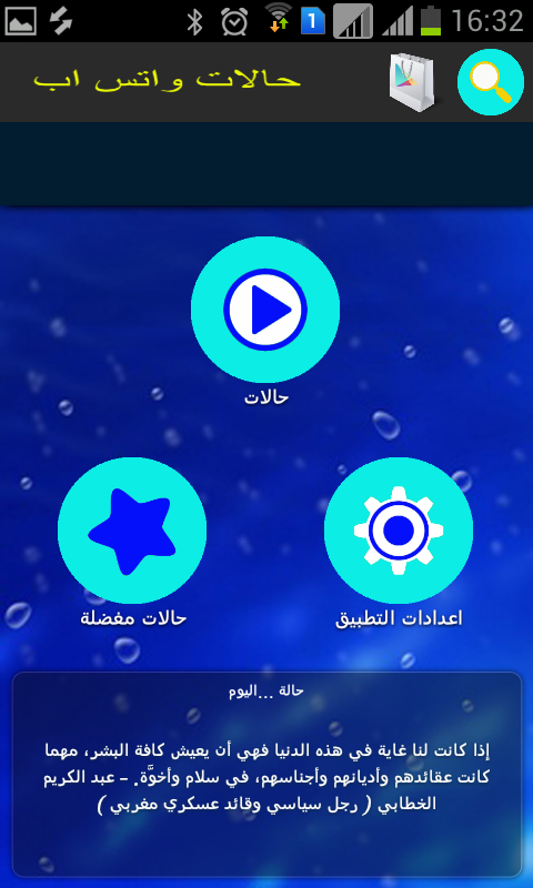 7- يحوي تطبيق " حالات واتس اب راقية " على مجموعة منوعة من " حالات منوعة, حالات معبرة , حالات الأصدقاء , حالات مضحكة , حالات حب , حالات خيانة , حالات للزوج والزوجة , حالات إسلامية , حالات دلع وغرور , عبارات ملل , كلمات حزينة , عبارات عن الفراق , عبارات عن الألم" ويمكنك أيضا من تفعيل ميزة الاشعارات لتصلك حالة اليوم تلقائيا وبشكل عشوائي .