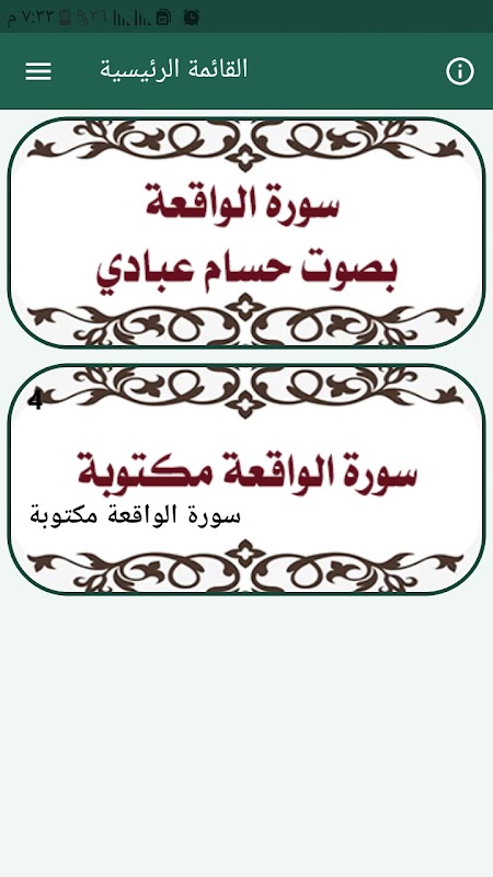 نضع بين ايديكم تطبيق سورة الواقعة مكتوبة بصوت جميل ورائع للقارى الشيخ حسام عبادي بدون نت