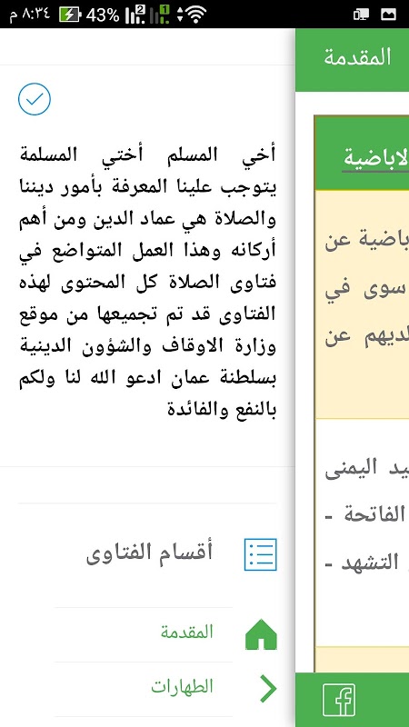 تطبيق فتاوى الصلاة لا يحتاج الى انترنت بعد التثبيت والفتاوى هي حسب مكتب الافتاء بسلطنة عمان يحتوي التطبيق على الكثير من الفتاوى المتنوعة وضعت حسب القسم المناسب لها ويحتوي على الاقسام التالية الطهارات الغسل من الجنابة وأحكامه أحكام الحائض والنفساء الوضوء ونواقضه القبلة واللباس والسترة الأوقات لأذان والاقامة النيه والتوجيه الاستعاذة والقيام إلى الصلاة القراءة الركوع والسجود والتشهد والتسليم أحكام الإمامة وصلاة الجماعة استدراك الصلاة في الشك والنسيان والبدل نواقض الصلاة إعادة الصلاة وقضاؤها السهو وأحكامه صلاة الجمعة صلاة المرأة صلاة السفر السنن والنوافل قيام رمضان صلاة الميت أحكام المساجد والمصليات وفتاوى متنوعة.