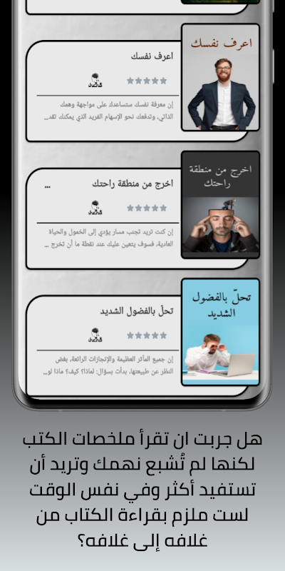 - يتيح لك فصل القراءة في التصنيفات الآتية: التطوير الذاتي والروحي، علاقات وتواصل، المال والأعمال، والأسرة وعلم النفس، الفلسفة والعقل، الفقه الإسلامي، قصص وتجارب وجاري العمل على إتاحة المزيد بإذن الله.