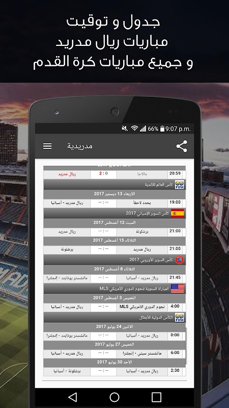 تطبيق مدريدية ★ هو تطبيق مجاني لمتابعة أخبار ريال مدريد من أفضل المصادر العالمية بالعربي و مشاهدة أهداف و ملخصات المباريات بجودة عالية ، بالاضافة الى جدول و توقيت مباريات ريال مدريد و جدول جميع مباريات كرة القدم و جدول مباريات اليوم و الأمس و الغد.
