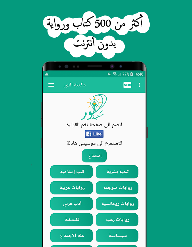 مكتبة النور هو التطبيق المثالي لك، فبواسطته يمكنك القراءة اونلاين وتحميل أكثر من 500 كتاب ورواية في مجالات متعددة ويمكنك تخزينها مباشرة في ذاكرة الجهاز لتتمكن فيما بعد من فتحها بسهولة في أي وقت دون الحاجة للاتصال بالإنترنت. كما يمنحك التطبيق العديد من الخصائص والمميزات منها :