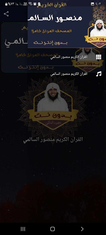 沒有網路的Mansour Al-Salmi應用程式以謝赫的聲音收集了整個古蘭經,聆聽謝赫的美妙聲音,他為他錄製了背誦的古蘭經,並且還有大量的歌曲,我們將為此專門開發一個單獨的應用程式。