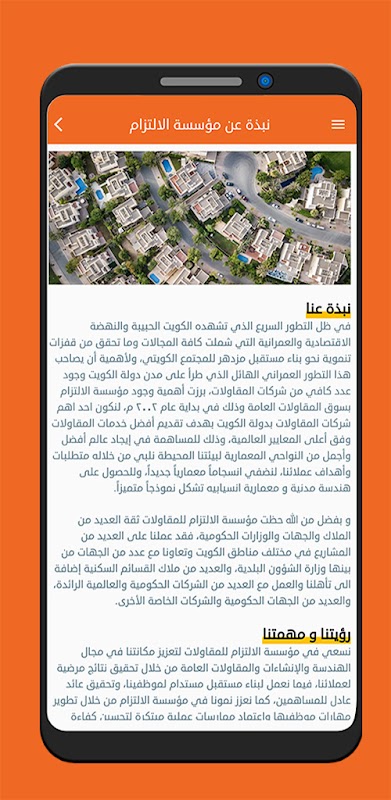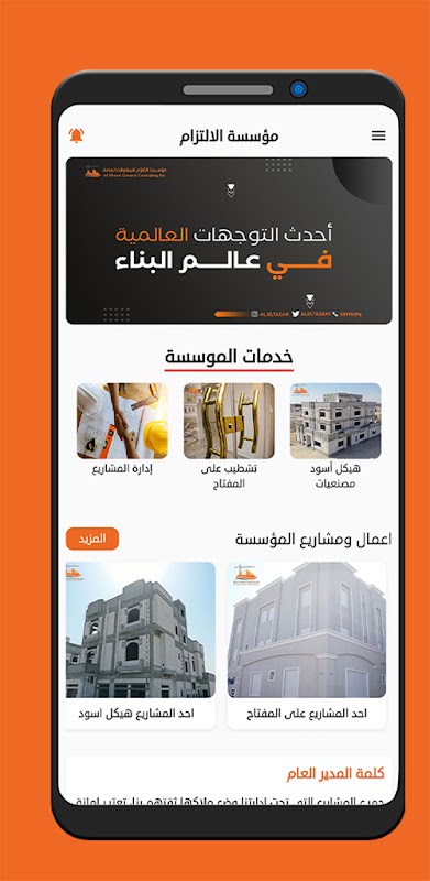 مؤسسة الالتزام للمقاولات العامة، المؤسسة الرائدة في مجال الإنشاءات ومواد البناء والعقارات عالية الجودة والبناء، بخبرة أكثر من ١٥ سنة في صناعة البناء ضمن منطقة الخليج العربي ومن ١٠ سنة في مجال التطوير العقاري كما تهدف شركة الالتزام إلى توفير أرقى خدمات التصميم الداخلي وأعلى درجات التنفيذ والهندسة المعمارية للمنازل والعقارات والمكاتب بمستويات عالمية。 فإذا كنت ترغب في تصميم وتنفيذ منزلك الجديد أو تغيير تصميم مكتبك بما يناسب احتياجات أعمالك المتغيرة.