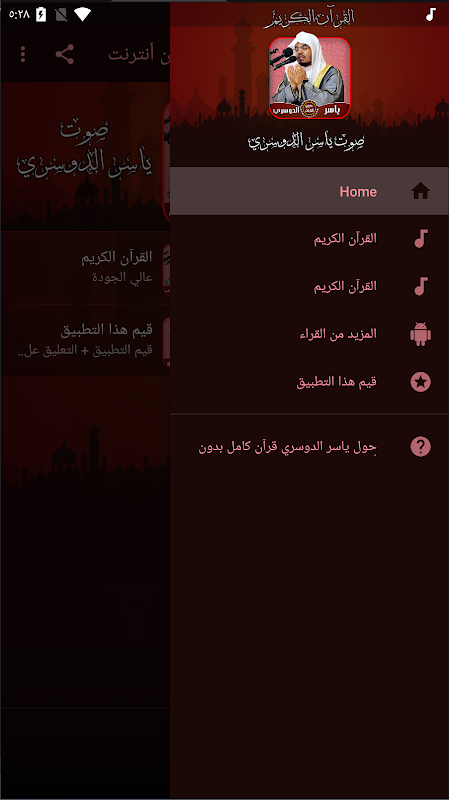 您可以通過應用程序本身中的選項(應用程序評估)來評估該程序,以免費下載帶有Sheikh Yasser Al-Dosari的《古蘭經》。