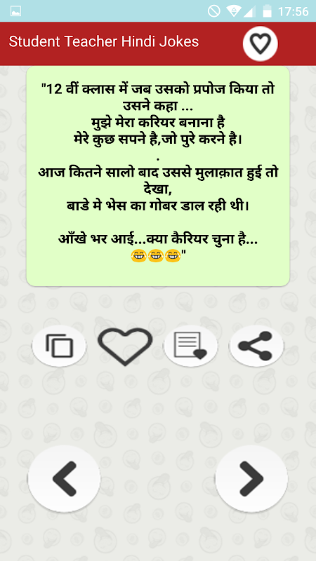您可以享受通過Facebook Twitter whatsapp等社交網站與您的朋友和家人共享的最有趣和娛樂性最高的印地語笑話集合。您可以通過在社交媒體網站(例如, Facebook Instagram,twitter,Linkedin,Google等,以及聊天工具(如WhatsApp,Snapchat,Hike等)上。您還可以將笑話以JPG或PNG格式的文本或圖片格式保存到手機內部存儲存儲器或手機SD卡中,並可以稍後分享為照片。