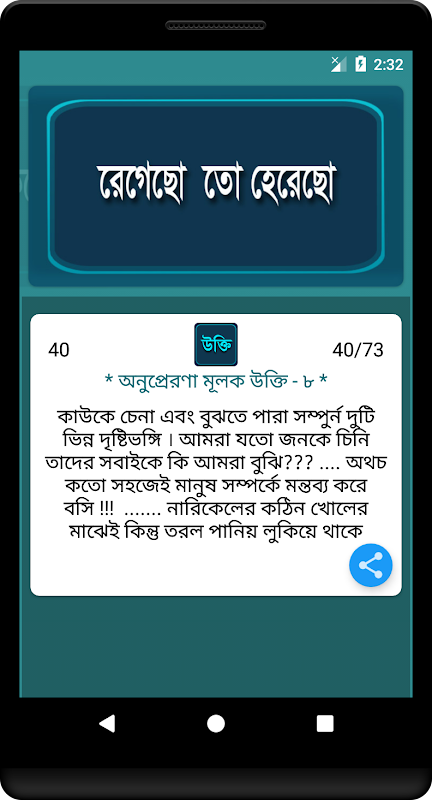 The App has been added Motivation & inspirational quote bani, also added Islamic bani & Islamic ukti, bangabandhu sheikh mujibur rahman humayon ahmed Updesh mulak Nobider Bikkhato baktider Nelson Mandela Kaji nazrul islam Jibon bodledeya Premer love and valobasar ukti baniIt is an Motivation Bangla App.