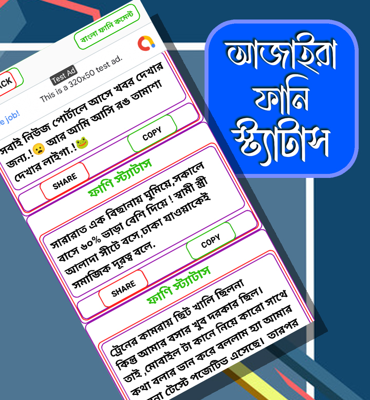 আজাইরাফানিস্ট্যাটাসনামটিশুনেইবুঝতেপারছেনএইঅ্যাপসম্পর্কে。 প্রিয়োজনদেরসাথে আজাইরাফানিক্যাপশনদিয়েআপনিএটাকেআজাইরাফানিএসএমএসহিসাবেওব্যাবহারকরতেপারবেন.ফানিবাংলাট্রলওমজারপোষ্টতৈরিকরেছি,জোকসওমজারকৌতুকথেকেযাশুনেআপনারমনআনন্দেভরেউঠবে。 নিউজেনারেসনেরপোলাপানআজকালবাংলাফানিস্ট্যাটাসসোসালমিডিয়াতেপোস্টকরতেদেখাযায়。 বাংলাফানিঅ্যাপ