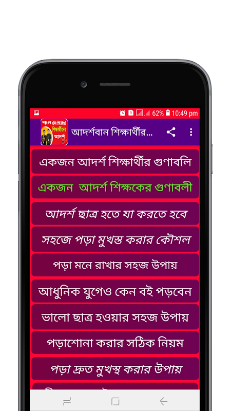 এই রকম বিভিন্ন কৌশল নিয়ে আমারা একটি মোবইল এ্যাপ তৈরী করেছি যেখানে পরিক্ষায় ভাল করার উপায় এবং পড়া মনে রাখার কৌশল এককথায় আদর্শবান শিক্ষার্থীর সকল গুনাবলী দেয়া আছে, যে গুলো অবলম্বন করে সহজেই পরিক্ষায় ভাল ফলাফল করা সম্ভব। এ্যাপটিতে যে সমস্ত বিষয় গুলো নিয়ে বিস্তারিত আলোচনা করা হয়েছে: