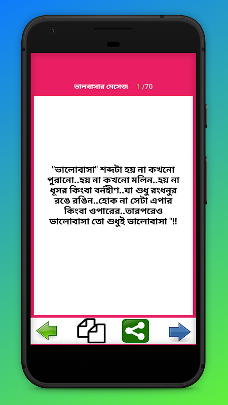 আপনারা এসএমএস খুঁজে পাচ্ছেন না বা মনে করতে পারছেন না কোন চিন্তা নেই আজ থেকে আর এসএমএস খুঁজতে হবে না।এখনি download করুন আর শুরু করুন sms পাঠানো এবং মজার মজার স্ট্যাটাস দিন facebook , gmail plus সহ অন্য অন্য যে কোন social media তে।প্রতিটি এসএমএস প্পি করে যে কোন জায়গায় পেস্ট করতে পারবেন কোন রকম ঝামেলা ছাড়া।