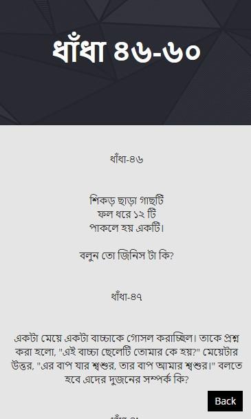 আমাদের এই অ্যাপ এর ধাঁধা গুলো একটু ব্যাতিক্রমী এবং বুদ্ধিতে শান দেয়ার মত রীতিমত। আশা করি আপনার খুব ভালো সময় কাটবে এই গুলো নিয়ে। পড়ে আপনাদের ভালো লাগবে।