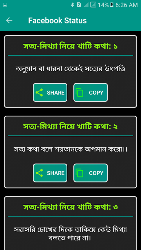 এই এপসটিতে মন মতানো সব খাটি কথা বা উপযুক্ত কথার এসএমএস পবেন, এই অ্যাপ টি ব্যবহার করতে প্রথম বার ওপেন করতে ইন্টারনেট কানেকশন লাগবে। তারপর নেটা কানেকশন ছাড়াই অ্যাপ টি ব্যবহার করতে পারবেন। আশা করি অ্যাপ টি ভালো লাগবে।খাটি কথা ফেসবুক স্ট্যাটাস ২০২১