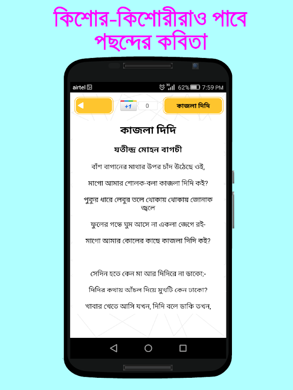 It is hard to find a person who in his/her childhood never read a poem or poetry (bangla chora or kobita). In fact, in our early school life we always had books like sonamonider chora, chotoder chora, chora gaan, kobita somogro, rhymes for baby/kids etc. and most of the cases this type of poetry books always be the favourite one for us. Our love for rhymes or poem pushed some of us to poetry writing. Sometimes we want to teach our children rhymes. In this app we accumulated hundreds of rhymes for kids and babies in bangla. Also we gathered many everliving and everloving poems in bengali.