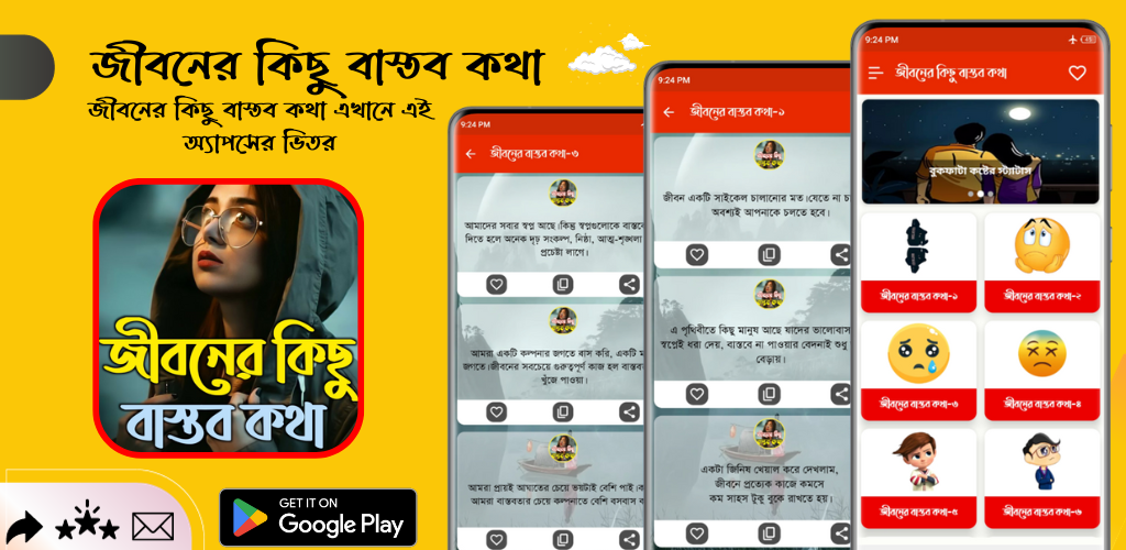 人類的生活是非常多樣化的。我們的生活充滿了幸福和悲傷、希望和失望、痛苦和磨難、心碎和心痛。人們在人生的不同時期接受現實。因此,根據人類生活不同困難階段的現實特點,這個應用程式中有一個關於現實生活的狀態、引言、標題、圖片的清單。