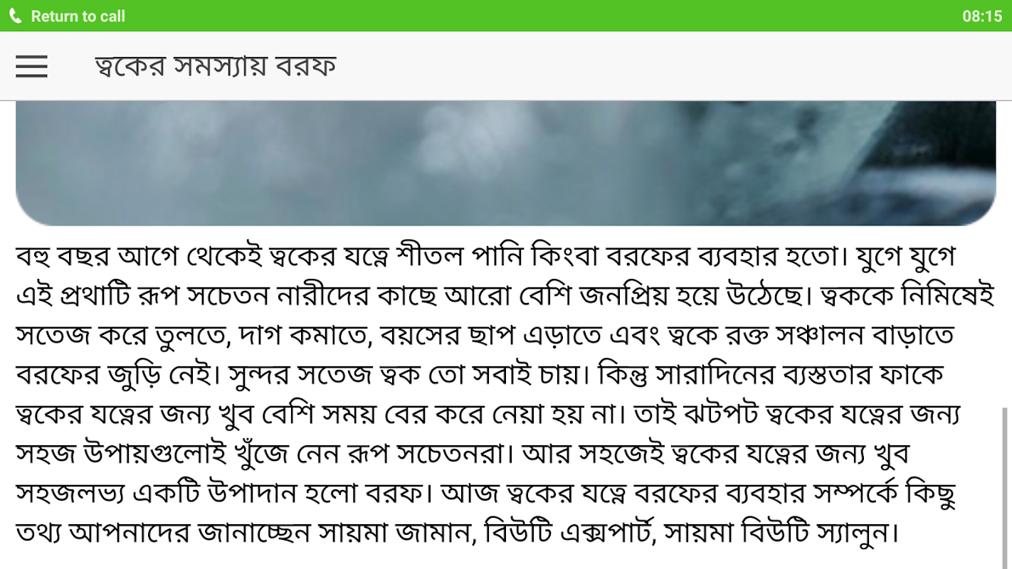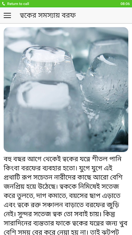 বহু বছর আগে থেকেই ত্বকের যত্নে শীতল পানি কিংবা বরফের ব্যবহার হতো। যুগে যুগে এই প্রথাটি রূপ সচেতন নারীদের কাছে আরো বেশি জনপ্রিয় হয়ে উঠেছে। ত্বককে নিমিষেই সতেজ করে তুলতে, দাগ কমাতে, বয়সের ছাপ এড়াতে এবং ত্বকে রক্ত সঞ্চালন বাড়াতে বরফের জুড়ি নেই। সুন্দর সতেজ ত্বক তো সবাই চায়। কিন্তু সারাদিনের ব্যস্ততার ফাকে ত্বকের যত্নের জন্য খুব বেশি সময় বের করে নেয়া হয় না। তাই ঝটপট ত্বকের যত্নের জন্য সহজ উপায়গুলোই খুঁজে নেন রূপ সচেতনরা। আর সহজেই ত্বকের যত্নের জন্য খুব সহজলভ্য একটি উপাদান হলো বরফ। আজ ত্বকের যত্নে বরফের ব্যবহার সম্পর্কে কিছু তথ্য আপনাদের জানাচ্ছেন বিউটি এক্সপার্ট।