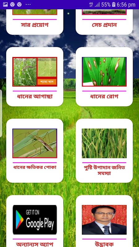 Paddy Expert App 是用於水稻種植的 A-Z 解決方案。該應用程序詳細介紹了BRII和BINA發明的水稻品種、苗床準備、水稻栽培技術、水稻植物疫苗接種、施肥、灌溉、水稻雜草防治、水稻病害防治、病蟲害防治和水稻營養問題。看到app裡附上的水稻病蟲害圖片或說明,識別正確的病蟲害後,就可以通過病蟲害綜合治理來控制水稻的病蟲害。如果這樣不行,如果水稻的病蟲害發生率超過規定的百分比,那麼最後的辦法就是通過化學防治管理以正確的劑量施用正確的農藥。然而,更多的重點放在應用程序中的綜合害蟲管理上。在應用程序中,您將能夠了解雜草控制、布里乾酪和非發明的季節性水稻品種以及水稻生長的階段和階段。
