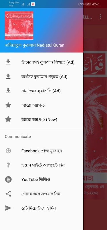 為了方便Nadia Qaeda紙質書的使用者,我們提出了翻書的功能。就像您可以打開一本書並開始閱讀一樣,此應用就像一本書。 Nadiatul Quran Nadiatul Quran啟動古蘭經教育應用程序後,您可以閱讀Manmat頁面。可以在阿拉伯語規則和《納迪亞特爾古蘭經》中找到的所有課程都可以在《納迪亞特爾古蘭經》中找到。