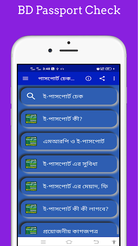該應用程序可用於檢查護照 bd 和電子護照在線檢查。您可以通過此應用程序檢查 BD Passport 狀態並找到您的 Passport bd 的狀態。