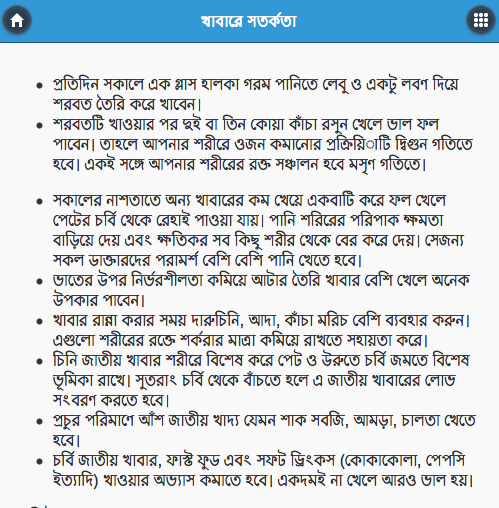 পেটের এবং সমস্ত শরীরেরই মেদ ও বাড়তি চর্বি কমানোর জন্যে যে সমস্ত বিষয় এই অ্যাপ থেকে জানতে পারবেনঃ