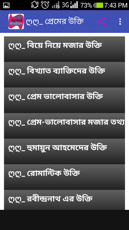 ফেসবুক এখন আমাদের কাছে বিনোদনের অনেক বড় একটা জায়গা হয়ে উঠেছে। অনেকেই এখন দিনের অনেকটা সময় ফেসবুক এ ব্যয় করে থাকে। আবার অনেকেই হয়তো ফেসবুকে স্ট্যাটাস দিতেও পছন্দ করেন। কিন্তু ঠিক ভাবে গুছিয়ে লিখতে না পারায় অনেকেই হয়তো status দিতে পারে না বা বিলম্ব বোধ করে । তাদের কথা চিন্তা করেই আমাদের এই অ্যাপটি। এপটির মধ্যে রয়েছে দুটি ক্যাটাগরিতে বাংলা স্ট্যাটাস এবং বাংলা এসএমএস।