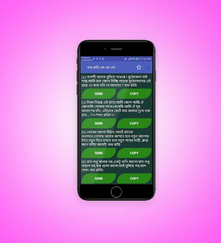 অনেক বেছে বেছে ভালো sms এর collection নিয়ে আমাদের এই বাংলা সুপার এসএমএস (Bangla super SMS) Apps ।আপনাদের feedback আমাদের জানান প্রয়োজনে আমরা app update করব। ভুল হলে দয়া করে বাজে comments করবেন না।আমাদের জানান আমরা ভুল সংশোধন করে নেব।ভালো থাকবেন সবাই।