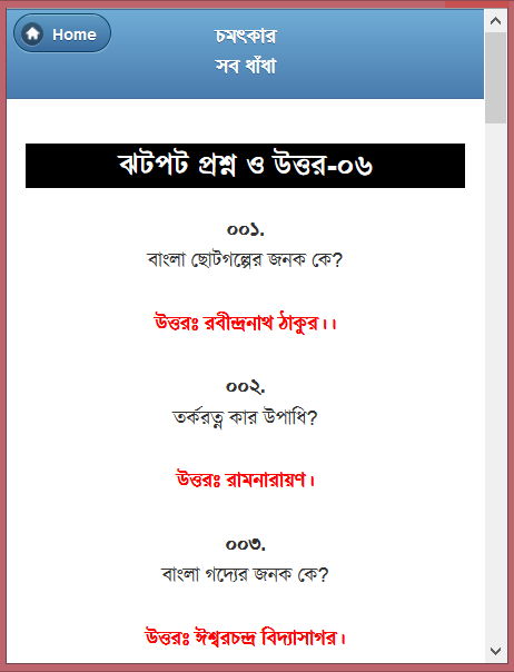 আমাদের এই অ্যাপটি মোটামোটি এক হাজারের মত ধাঁধা এবং ঝটপট প্রশ্নের উত্তর নিয়ে ডেভেলপ করা হয়েছে। এটি খুব সহজভাবে সাজানো হয়েছে। এই অ্যাপটি আশা করি ব্যবহারকারীদের জন্য অনেক গুরুত্বপুর্ন একটি অ্যাপ হবে এবং তদের অনেক উপকারে আসবে।