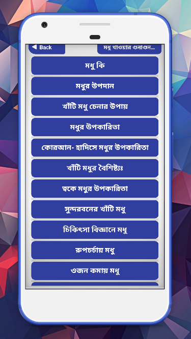 এই অ্যাপটিতে আরও রয়েছে-মধু কি মধুর উপাদান খাঁটি মধু চেনার উপায় মধুর উপকারিতা কুরআন - হাদিসে মধুর উপকারিতা খাঁটি মধুর বৈশিষ্ট্য।ত্বকে মধুর উপকারিতা সুন্দরবনের খাঁটি মধু চিকিৎসা বিজ্ঞানে মধু রোগ নিরাময়ে মধু মধুর বিভিন্ন গুণাবলি মধু ও কালোজিরার ব্যবহার।