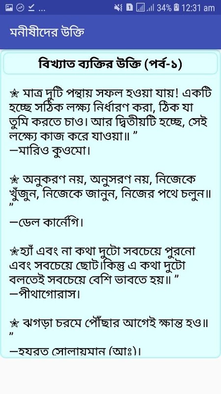 বিখ্যাত উক্তি বা মনিষিদের উক্তি গুলো মনীষীদের জীবনী থেকে নেওয়া হয়েছে। মনীষীদের উক্তি যা কিনা মনীষীদের জীবনী তা থেকে জানতে পারি তাদের জীবনের বাস্তব অভিঙ্গতার একটি বহি প্রকাশ। তারা তাদের জীবন থেকে যে শিক্ষা গ্রহণ করছে তা আমাদের পরবর্তী প্রজন্মের জন্য মনীষীদের বাণী হিসাব আসছে। এই বানি বা বানি চিরন্তন গুলোকে আমাদরে সকলের পড়া এবং মানা উচিৎ । আমরা যদিি এই বানি বা বানি চিরন্তন গুলি মেনে চলতে পারি তাহলে আমরা আমাদের জীবনে সফলতা ইনশাআল্লাহ পাব। আমাদের এই অ্যাপটিতে ইসলামিক বানী ও যোগ করা হয়েছে। ইসলামিক বাণী গুলোও আমাদের কে অনুপ্রাণিত করে জীবনকে সফলতার দিকে নিয়ে যেতে। তাই আামদের এই বাংলা উক্তি সমগ্র অ্যাপটির গুরুক্ত অনেক। এই বাংলা উক্তি সমগ্র আপনারা ফ্রি তে ডাউনলোড করতে পারবেন। আপনাদের বাংলা উক্তি গুলোকে আয়ত্ত করা খুবই সহজ হবে।