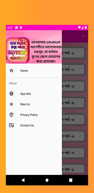 আপনার ভালোবাসার মানুষটিকে সব সময় কাছে পেছে বাংলা এসএমএস, love sms প্রেম ভালোবাসায় এই এসএমএস কালেকশন মনের মানুষটিকে কাছে টেনে আনবে। ভালোবাসার শুরু হয় ফেসবুক স্ট্যাটাস থেকে কিংবা প্রেমের কবিতার মত নিজেকে ভালোবাসার উক্তি দিয়ে সাজিয়ে প্রেমের ছন্দের মত নিজেকে রোমান্টিক করতে পারলেই ভালোবাসার জন্ম সেখান থেকেই শুরু হয়। মেয়েদের মন জয় করতে সবার জন্য বিশেষ আকর্ষন মেয়ে পটানো মেসেজ। মিষ্টি প্রেমের রোমান্টিক দিনগুলোতে প্রেমের মেসেজ, ভালোবাসার sms। প্রেমকে জমিয়ে তুলতে ভালোবাসার মেসেজ বা প্রেমের এসএমএস। আমাদের এই অ্যাপটিতে পাবেন মনের মানুষকে কাছে পেতে ও তাকে পটাতে মেয়ে পটানো কিছু এসএমএস।এছাড়াও রয়েছে ভালোবাসায় বিরহ আসলে মনকে হালকা করতে কষ্টের এসএমএস বা কষ্টের স্ট্যাটাস।