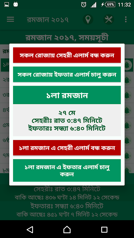 ৩। সাহরী এবং ইফতারের এলার্ম। সাহরী অথবা ইফতারের কত সময় পূর্বে এলার্ম বাজবে, তা সিলেক্ট করার ব্যবস্থা।