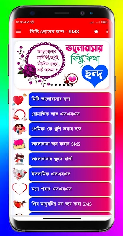 প্রিয়মানুষটিকেখুশিকরতেকতকিছুইনাকরতেহয় কখনো ভালোবাসার মেসেজ পাঠিয়ে কখনো বা মজার জো ঁকসবলেতাইপ্রিয়মানুষটিরসাথেএসএমএসএরভাষ ায় কথা বলুন রোমান্টিকতা আপনাদের মাঝে চলে আসবে ।ভালবাসারমানুষেরসাথেকথাহবেছন্দে,ছন্দে।সম ্পার্কমধুময়রখতেতুলেধরাহয়েছেআধুনিকনিউ ছন্দ সমাহার। ভালোবাসারপ্রিয়মানুষটিকেভালোরাখতেআমাদে রঅ্যাপটিতেপাবেনভালোবাসারএসএমএস,রোমান্টিক এসএমএস,বাংলা হাসির এসএমএস,ইসলামিক এসএমএস, বন্ধ ুত্বেরএসএমএস,মরেপড়ারএসএমএস,শুভরাত্রিএসএম এস