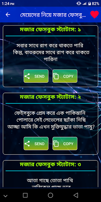 তাদের কথা চিন্তা করেই আমাদের এই অ্যাপটি। এখন থেকে আপনাদের মনের ভাবগুলি ফেবুক স্ট্যাটাস এর মাধ্যমে সেয়ার করা আরো সহজ হবে।