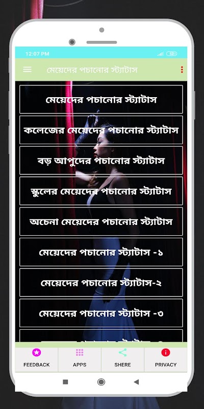 এই অ্যাপস টি পড়লে মেয়েদের পচানোর স্ট্যাটাস পাবেন। অনেক মেয়ে আছে ছেলেদের শুধু পচায় বা রাগায়। কিন্তু অনেকে জানেন না মেয়েদের কি ভাবে পচাতে হবে। ছোট ছোট কিছু কথা আছে যা বল্লে মেয়েরা সহজে ক্ষেপে যায়। অনেকে আবার সরা সরি পচাতে পারেন না ।তার জন্য স্ট্যাটাস দিয়ে পচাতে পাড়েন। আরো পাবেন মজার মজার এস এম এস ,পোস্ট ক্যাপশন। আরো পাবেন মজার মজার কবিতা ছন্দ।ভালোবাসার এস এম এস