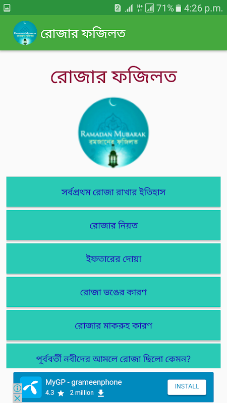 এই এপ্স থেকে জানতে পারবেন রোজা রাখার প্রথম ইতিহাস, রোজার নিয়ত, ইফতারের দোয়া, রোজা ভঙ্গর কারন, রোজা মাকরুহ এর কারন, নবীদের আমলে রোজা কেমন ছিল ইত্যাদি।
