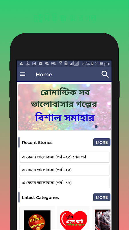 Romantic Valobasar Golpo অ্যাপ্লিকেশনটির মধ্যে আপনারা সবাই প্রতিদিন রোমান্টিক ভালোবাসার গল্প পড়তে পারবেন।