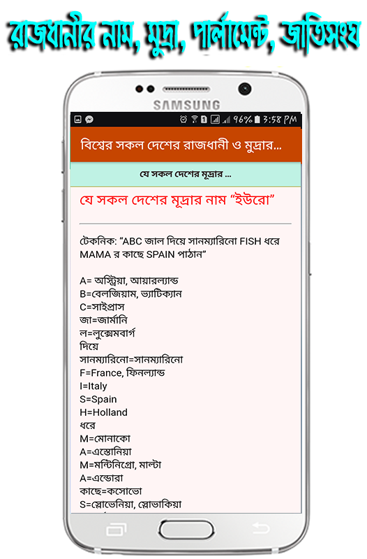সব থেকে ভাল ব্যাপার হল আপনাদের দেশ, রাজধানী ও মুদ্রার নাম গুলো মনে রাখার জন্য শর্টকাট উপায় রাখা হয়েছে...যা আপনাদের বিভিন্ন পরিক্ষায় কাজে দিবে...