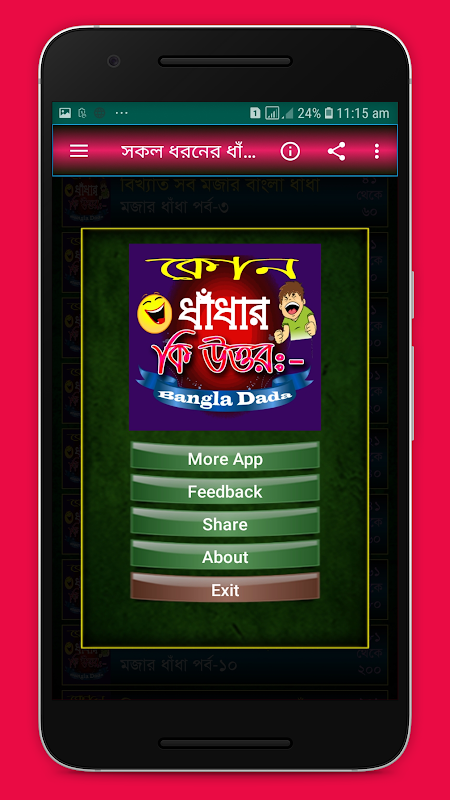 আমাদের অ্যাপে থাকছে ধাধা ও উওর,ধাধার আসর,বাংলা ধাধা ,মজার ধাধা,মজার জোকস,মজার প্রশ্ন,ধাধার বই,সাধারন জ্ঞান ,গ্রাম বাংলার ধাধা,বুদ্ধির প্রশ্ন,আইকউ আরো বুদ্ধি যাচাই এর অনেক কিছু।