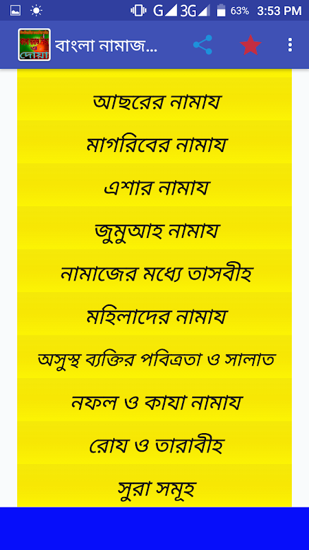 সঠিক ভাবে নামাজ পরার জন্য বাংলা নামাজ শিক্ষা (namaj - বাংলা নামাজ শিক্ষা)অ্যাপসটি ডাউনলোড করেনিন আজই।নামাজ সম্পর্কে গুরুত্বপূর্ন মাসয়ালা শিখুন এবং নামাজের ভুলক্রুটি থেকে মুক্ত থাকুন।