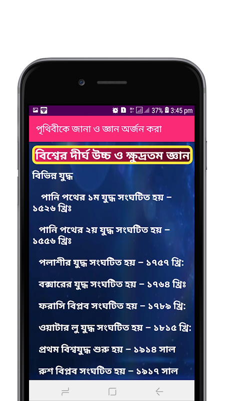 জানার কোনো বয়স নাই।জ্ঞান অর্জনের কোন শেষ নেই।তাই আজ আপনাদের জন্য নিয়ে আসলাম সবার জন্য সাধারন জ্ঞান সব বিষয় ২০২০। আমাদের অ্যাপে আপনি বাংলাদেশ ও আন্তর্জাতিক পর্যায়ে সকল ধরনের জ্ঞান অর্জন করতে পারবেন। তাছারা বি সিএস পরিক্ষার জন্য স্পেশাল ভাবে আলোচনা করা হয়েছে যা পাবেন আমাদের অ্যাপে। বাংলা,ইংলিশ,গনিত,মহাবিশ্ব,সম্পর্কে সাধারন জ্ঞান দেওয়া আছে।