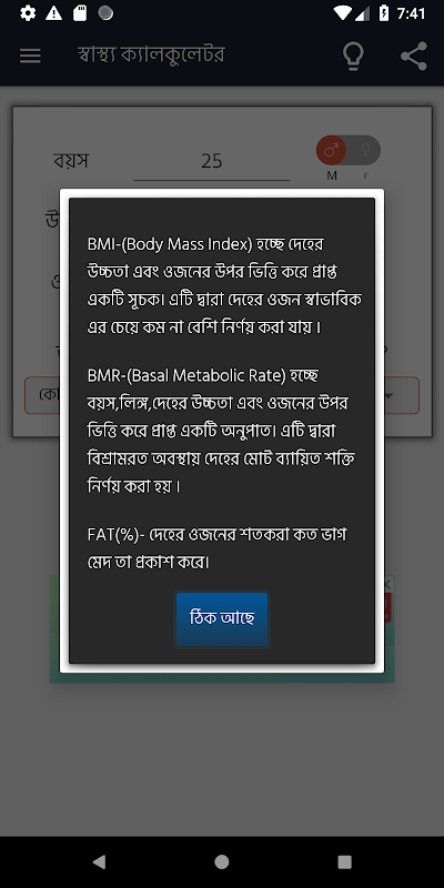 আপনারওজনবেশিহোক,বাওজনকমহোক - উচ্চতাঅনুযায়ীওজনঠিকআছেকিনা,এটাসবসময়েখেয়ালরাখাদরকার。 তবেওজনপরিমাপকরারজন্যআমাদেরপ্রায়ইদৌড়াতেহাসপাতালবাক্লিনিকে - যেটাবেশঝামেলার。 আররাস্তারপাশেযারাদুইটাকারবিনিময়েওজনমেপেদেয়,তাদেরযন্ত্রশরীরেরআদর্শওজননির্ণয়করারজন্যকতটাউপযোগীতানিয়েযথেষ্ঠসন্দেহকরারকারনরয়েছে。 তাইবলেকিহাজারহাজারটাকাখরচকরেবাসায়ওজনমাপারমেশিননিয়েআসবেন? সেইচিন্তাযদিআপনারমাথায়এসেথাকে,তবেবাদদিয়েদিন。 কারনআপনারকথামাথায়রেখেইআমরাএকটিআদর্শওজনক্যালকুলেটরপ্রস্তুতকরেছি。 এইওজনক্যালকুলেটরদিয়েআপনিখুবসুন্দরভাবেআপনারবিএমআইহিসেবকরতেপারবেন。 বাজারেযতগুলোউচ্চতা-ওজনক্যালকুলেটরআছে - সেগুলোরসেরাটিরসাথেআমাদেরএইওজনমাপার應用নিয়েআপনিপাল্লাদিতেপারবেননি:সন্দেহে。 এইএ্যাপটিব্যবহারকরারবড়একটিসুবিধাআপনিযেকোনওসময়েইএটিদিয়েআপনারওজনমাপতেতোপারবেনই,সেইসাথেট্রাকরেকর্ডওরাখতেপারবেনখুবভালমত。 ওজন/উচ্চতাবাড়ানোরউপায়হিসেবেওএইএ্যাপটিব্যবহারকরতেপারবেন。 কারনএগুলোবাড়ানোরজন্যআপনাকেপ্রতিনিয়তএগুলোট্রাককরতেহবে。 আবারওজনকমানোরব্যাপারেওএইএ্যাপটিআপনাকেসহায়তাকরবে。 কাজেইআরদেরিকেন? আপনিযদিসত্যিইএকটিভালউচ্চতা-ওজনক্যালকুলেটরখুঁজতেখুঁজতেএখানেএসেথাকেন - তবেএখনইএ্যাপটিডাউনলোডকরেফেলুন。