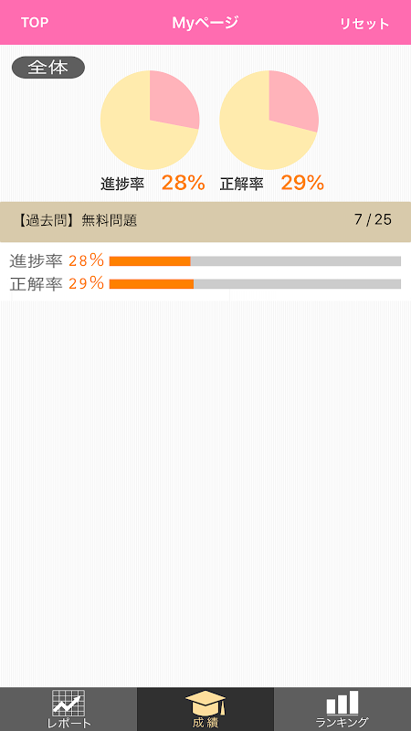 分野別に学習進捗率・正誤数を確認!さらに、ユーザー内の自分のランキングや学習記録を確認することで、毎日の学習管理も行うことができます。